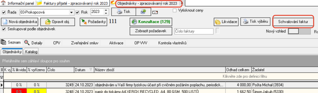 - Likvidace objednávky - tlačítko "Schvalování faktur"
