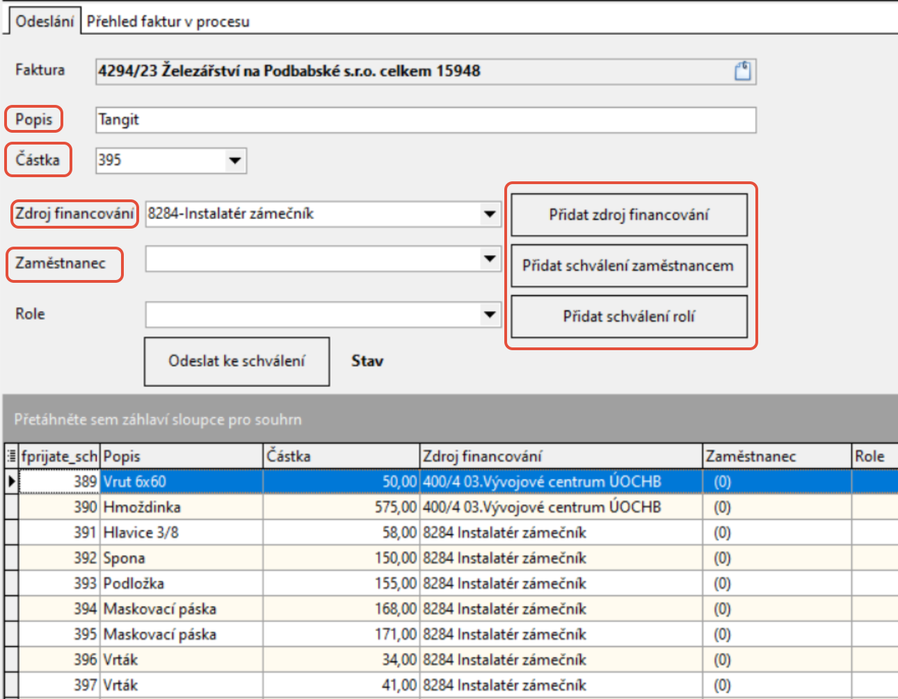Jestliže na fakturu byla objednávka, cena je automaticky rozdělena na jednotlivé položky a granty, ze kterých je placená. Po kliknutí na "odeslat ke schválení, se faktura odešle všem řešitelům/vedoucím odd. jako požadavek ke schválení do Albíny.