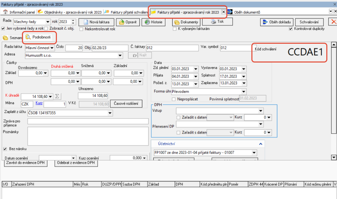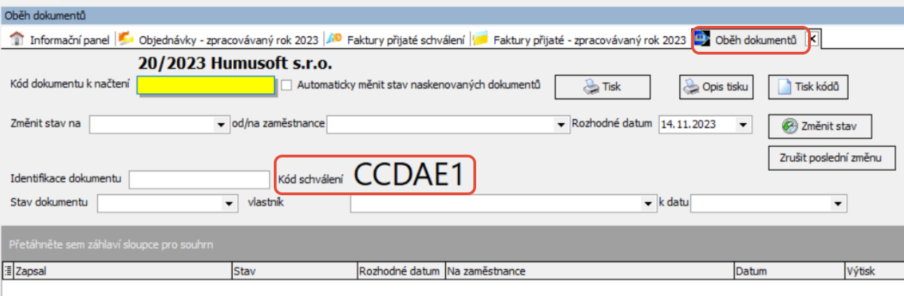 V této fázi lze kliknout na "Schváleno" a zobrazí se schvalovací kód, který se napíše na fakturu do pole pro podpisy schvalovatelů. Tento kód se automaticky zobrazí i v detailu schválené faktury a v oběhu dokumentů.