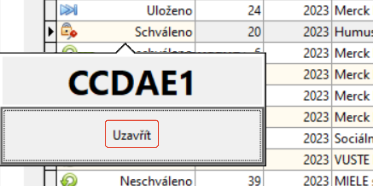 Po kliknutí na "Uzavřít" se změní stav faktury na "Ukončeno". Do přenačtení seznamu faktur ke schválení bude řádek stále zobrazen se stravem "Ukončeno". Po zavření a otevření okna, nebo po přenačtení požadavků ze seznamu zmizí.