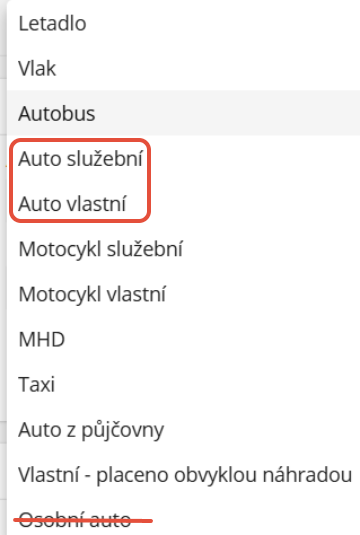 | Dopravní prostředek | -bez dopravy- Spolujezdec Letadlo Vlak Autobus Auto služební Auto vlastní** Motocykl služební Motocykl vlastní** MHD Taxi Auto z půjčovny Vlastní - placeno obvyklou náhradou | (výběr z rozbalovacího menu) |