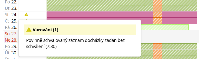 V docházce se u schválené cesty objeví žlutý výstražný trojúhelník, který pouze oznamuje, že cesta byla schválena v OKbase v části cesty a ne v docházce (což je v pořádku). Toto varování ignorujte, nemá vliv na uzavření docházky.