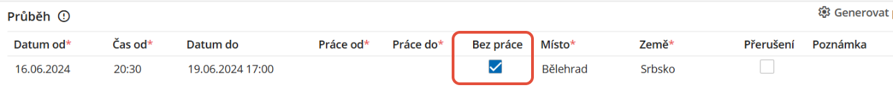 - Bez práce - Aby se doba pracovní cesty rovnala pracovní době zaměstnance, je nutné ve zprávě v části "Průběh" zaškrtnout pole "Bez práce".