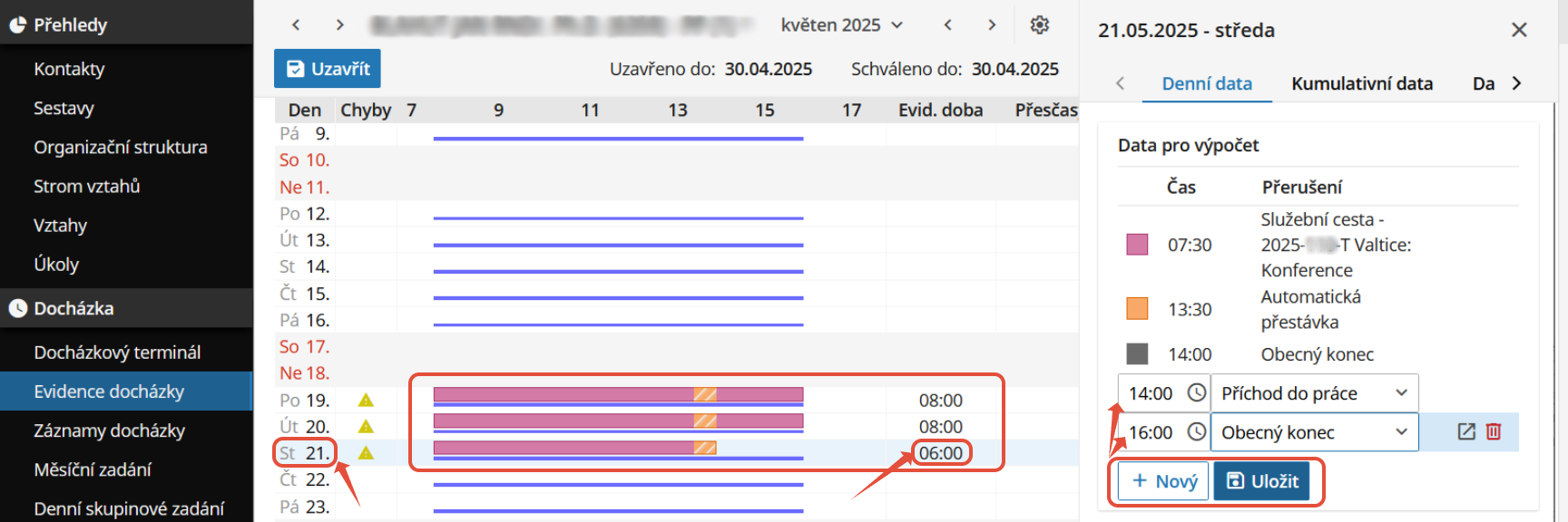 Postup doplnění chybějících hodin v docházce (příklad, kdy pracovní cesta (19. 5.-21. 5. 2025) byla ukončena ve 14:00 a směna zaměstnance končí v 16:00):