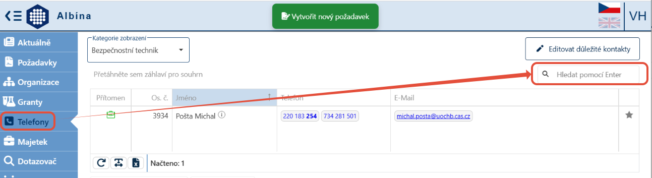 V části Telefony je možné nyní vyhledávat kontakty podle jména, osobního čísla, ústavní telefonní linky nebo čísla mobilního telefonu.